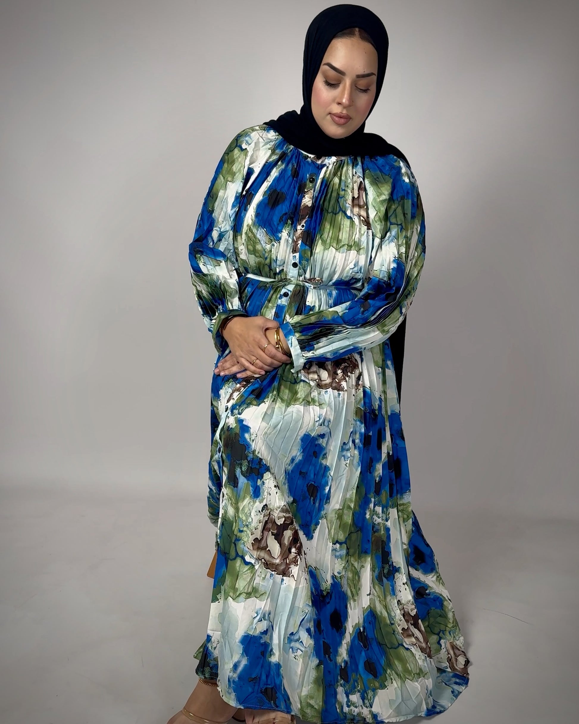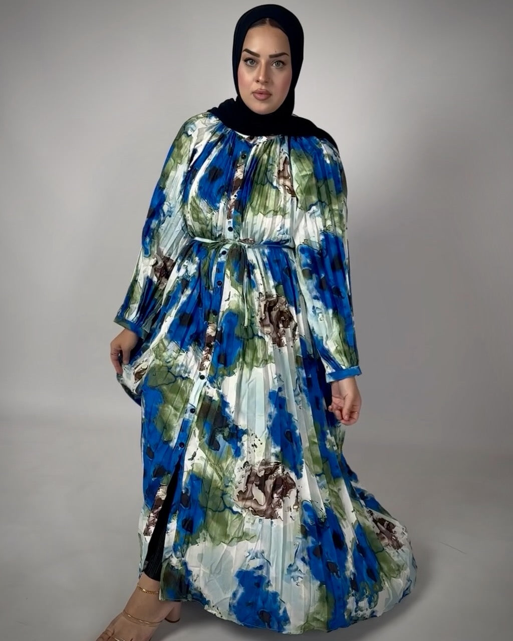 This pleated maxi dress drapes fluidly with every step — soft, poetic movement captured in watercolour tones. A modest, free-flowing one-size silhouette that flatters without effort, effortless from day to night.